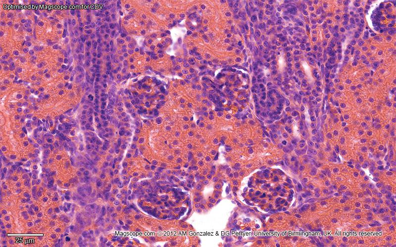 High magnification image of the renal cortex illustrating corpuscles, glomeruli, proximal and distal tubules and collecting tubules